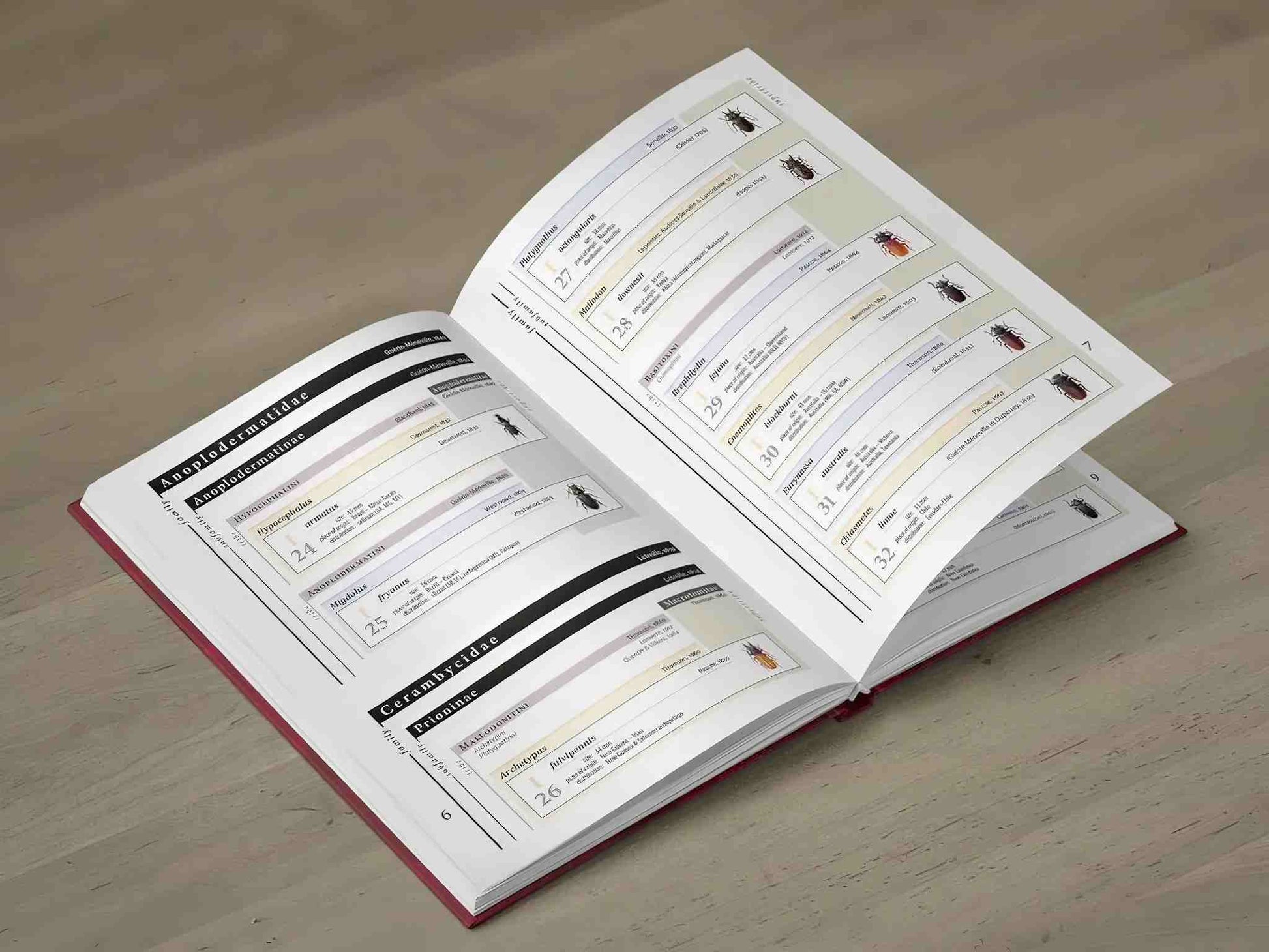 Druhou důležitou částí knihy je přehledný, hierarchicky uspořádaný seznam exemplářů. Tento seznam graficky znázorňuje taxonomické zařazení jednotlivých exemplářů a je možné z něj snadno a rychle odvodit biologické zařazení do čeledi, podčeledi, nadčeledi, kmene, rodu a druhu. Údaje o velikosti exempláře a místě jeho nálezu doplňuje informace o rozsahu rozšíření daného exempláře.