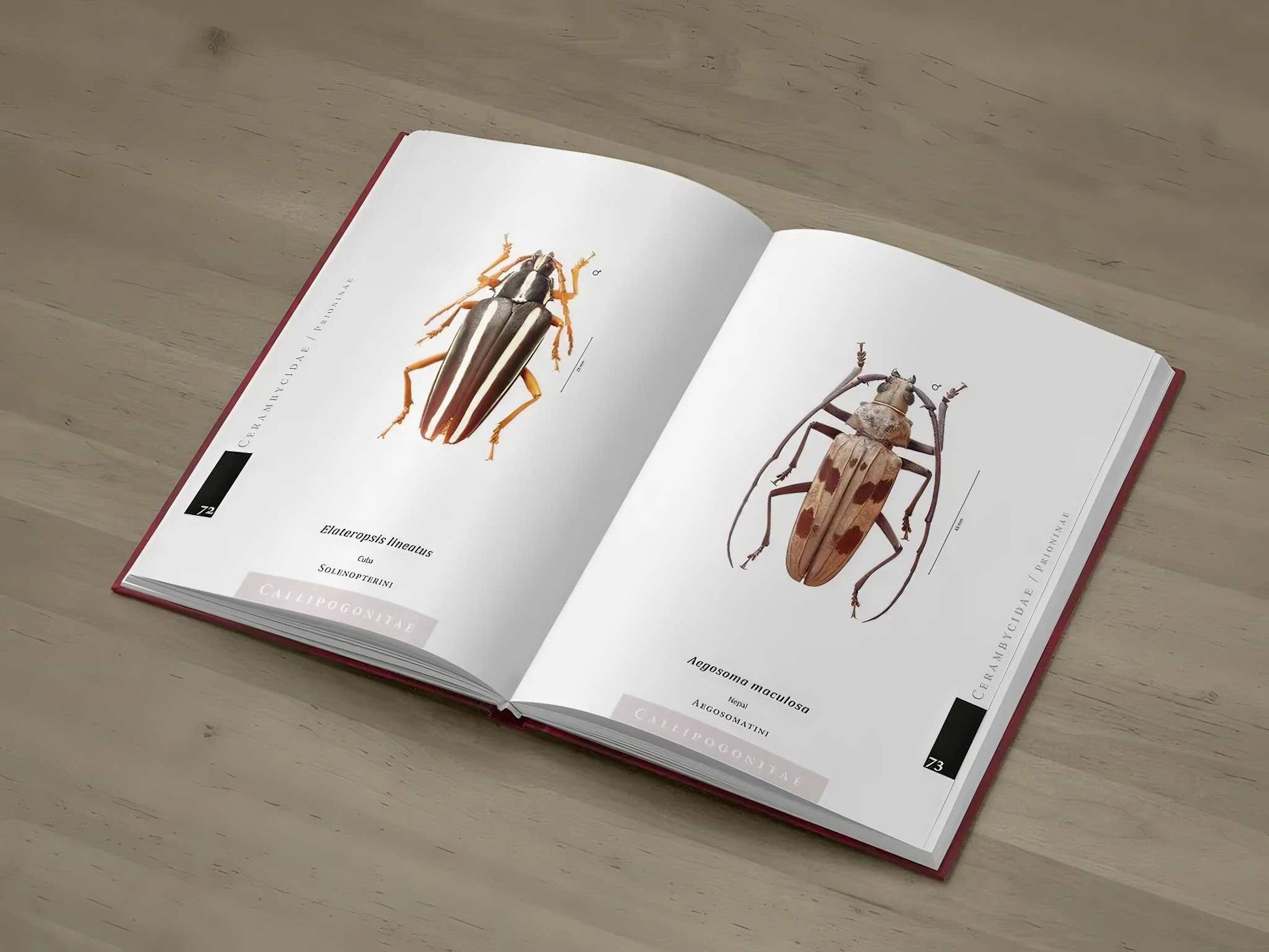 Každý exemplář je doplněn informací o taxonomickém zařazení a o skutečné velikosti, pohlaví a původu konkrétního exempláře.
